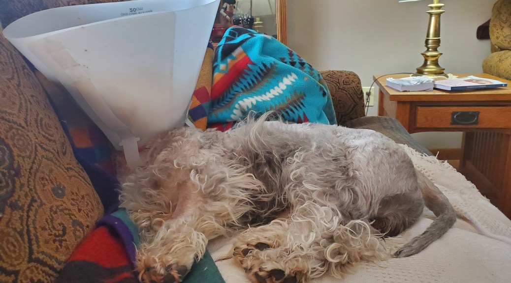 I considered a dog recovery suit just for this purpose, but I couldn’t find one in town, and if I ordered one, it would take too long to get here. I also didn’t relish the idea of wrestling him into an infant onesie every time he needed to go outside. We can’t crate him easily with the cone on, so he hangs with us and looks miserable. We hope for quick healing so the cone can go away.