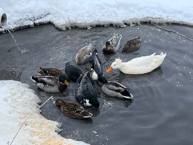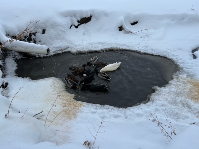 The ducks are spending all their time in the pond with this cold weather. Maybe to stay warm, maybe to keep it from freezing. It has shrunk up a little bit as the stream of water coming into it is pretty light. We seem to have picked up a couple stray ducks. One flies away when Kelly approaches, but there’s still an extra in the pond too. Alumni? Possible. And the chickens don’t have much interest in coming out of the coop either. Kelly opens the doors and throws out corn for them. But no Thanks. We’re fine. They do have water, corn, and egg layer ration in the pens. No reason to come out if they don’t want too. The guineas come out a bit further, but even they don’t go far.