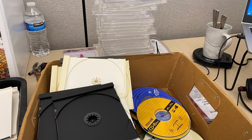 Bottom line is that for the past 18 months, I’ve had two boxes full of unusable CDs under my desk. Nobody has asked about them since I got back from furlough. Even if they did, without the spreadsheet, finding any data would be nie on impossible. And nobody knows where the portable reader is anyway. Rather than asking any more about it, I just informed my boss last week that I was dumping them. Luckily we have CD/DVD recycling at my company AND I personally have a use for the plastic cases that many of them were stored in. Took me about an hour to separate the CDs from the cases and/or sleeves (header photo). Broke two fingernails. And all the while I was thinking about how the technology changed to the point where the data was lost to us.
