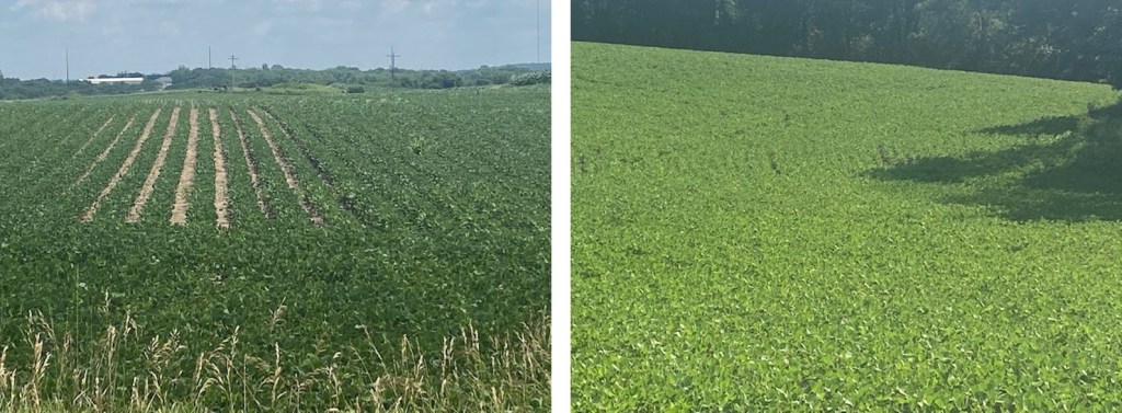 and the beans are looking good. Everything has been sprayed for weeds, and using the 15 inch rows on soybeans, they’ve started to canopy enough that there really shouldn’t be any more weed pressure. We will continue to monitor for bugs, around here that is soybean aphids. But those can vary from year to year and then you still need enough bugs to cause enough damage to justify the cost of spraying: the ‘economic threshold’. We don’t spray for just a few bugs. Sometimes soybeans get weather related funguses that can cause issues. So we keep an eye on all the crops.