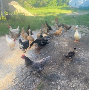 Rooster number three had a wound on his leg last week, kind of upper thigh area. Enough that he was dripping blood. Don’t know what he was into or up against, but he’s recovered and still chasing off rooster number one. Of our three guineas, two must’ve been on nests as one was by itself for several days. Now there’s two again. It would be nice if they could hatch out a batch. They make their nests in tall weeds somewhere and I generally only find them by accident. And they’re terrible mothers as a rule. The one Guinea we have has done real well the last couple years. As with the ducks this spring, it will be Kelly chasing them down and trying to catch them if we get that far. But it would sure be nice to have a dozen guineas around. May have to order babies next year.