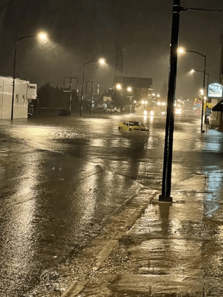 The following photo is of a main street in town that I drive on every day to work. I never really noticed the low spot where the yellow car is sitting. There are apparently lots of these low spots on the street, and they all flooded briefly. I have lived here for 35 years and I never noticed them. Now I notice lots of these low spots all over town.