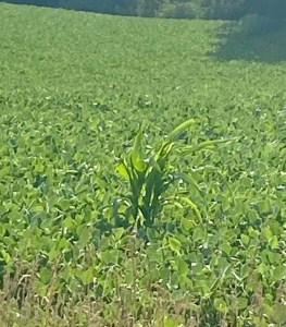 That’s called ‘volunteer corn’ and it can be a problem in soybeans. Because we use crop rotation, usually a bean field this year was corn last year. If a storm or disease knocked down the stalk of corn, depending how much it’s fallen over, it can make picking it up at harvest that much harder. A lot of ears may fall to the ground and grow voluntarily in the field next year. Hence the term, volunteer corn. It doesn’t generally reach maturity with full ears, but depending on the amount, it’s competing with the soybean crop and it can be a problem at harvest.