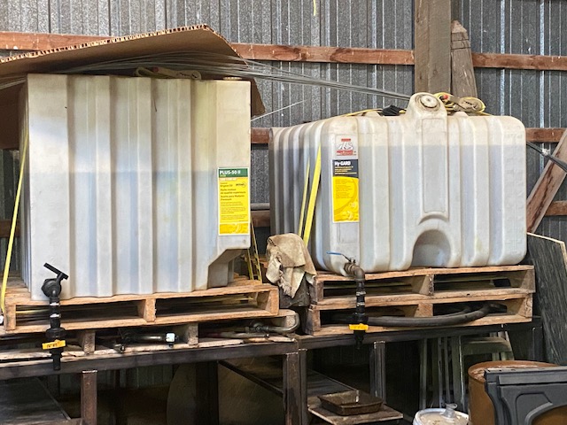 100 gallons engine oil on the left. 120 gallons trans / hydraulic oil on the right. Will last a couple years.