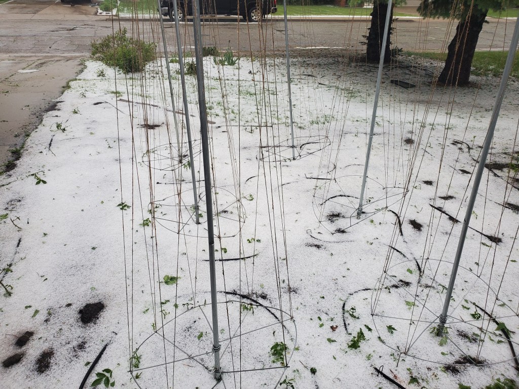 There was no hail in the part of town our office building is in, but our home neighborhood got nailed. The hail was about 1/2 inch in diameter. I think much of the garden is lost.