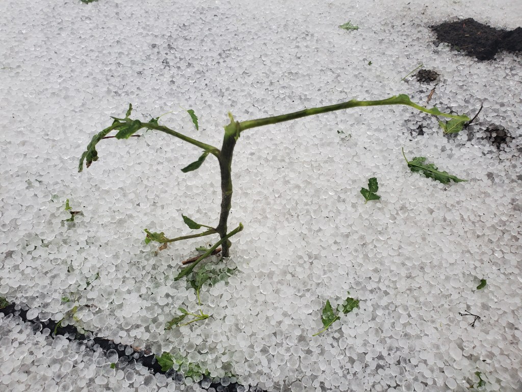 This is disappointing, to say the least. We still have some cabbage plants and cantaloupes to put out, and I think the chard, kohlrabi, and peas are ok. Tomatoes, peppers, and pole beans may be lost. It is too early to say. We never had a hail storm like this, either, so I don’t know how plants recover after something like this.