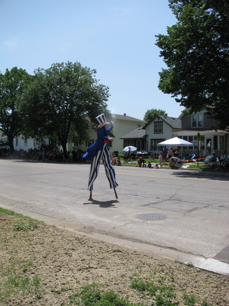 The Parade at noon on Sunday is kind of a big deal – I think it’s the only city-wide parade all year. People start staking out their territory on Saturday, cordoning off their turf or setting out awnings, blankets, and lawn chairs. I got there right at noon, expecting to just stand, but was able to sit on an unoccupied stair step for a while – Husband came later.