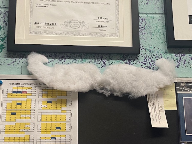 After Paul finishes building the set, he leaves some bit of decor in the office. This year it was Version 1 of the Nutcracker’s mustache.