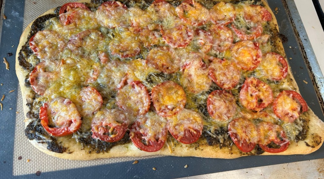 You’d think that with all the tomato dishes we’ve had in the last few weeks that I would not be craving yet another tomato recipe. The last couple of days I’ve been thinking about pizza – specifically Boludo’s, which we haven’t had in a while. But the combination of my knee (had therapy yesterday morning and was quite sore) and all the tomatoes on the counter and all the pesto in the fridge overtook my desire to order in.