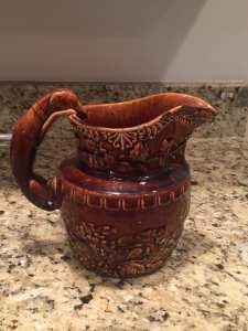 Long, long ago, when your great grandma, was a young girl, a man in the family (quite possibly her father, but maybe not) regularly drank more than was prudent. Each day (or possibly more or, less often) he would send one of his 3 sons, (if indeed it was Grandma’s father) to a neighborhood bar to have this brown pitcher filled with beer, and returned to quench his thirst. Grandma developed a loathing for what excessive drink could do to a man.