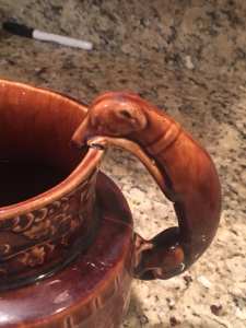 Author’s note: I have thoroughly examined the pitcher for any identifying marks and found nothing etched, stamped or printed anywhere on it to help identify where or when it began. It is fairly small, about 7 inches high. Notice that the handle appears to be a greyhound. What’s up with that? In any case, if the back story is at all accurate, we assume that the pitcher is at least as old as my grandmother would be; she was born in 1890, so nearly 130 years, but it could be older.