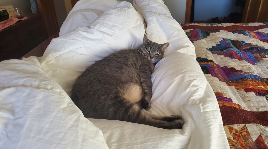 I couldn’t find the cat yesterday afternoon, so I looked in our bedroom and found her snuggled in the down comforter we keep on our bed. She had been there for hours. You can see her in the header photo. She looks pretty comfortable, I think.