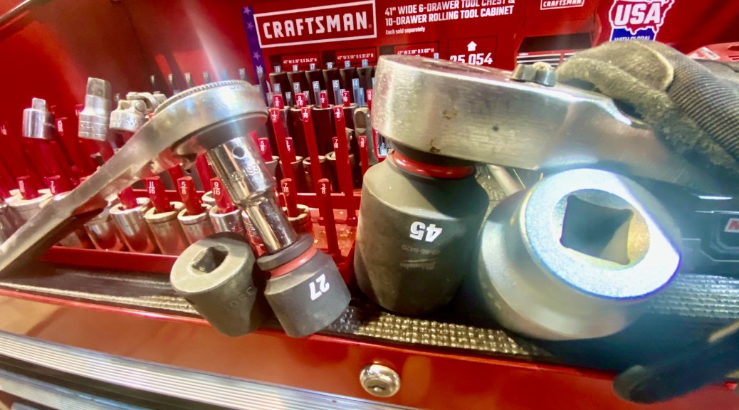 I finally got around to working on the brush mower. I had to order bigger sockets to get the nut off the broken spindle on the big spinny thing. (It’s 45mm by the way) And then trying to get the gear box off the mower deck, I didn’t have the right size sockets for that either. It’s 30mm. I am getting more and more metric tools, but I didn’t have anything that big. I have a 3/8” drive socket set that I use for a lot of things. And a 1/2” drive set for some of the bigger stuff. And then I started buying 3/4” drive stuff for the really big stuff. (I mean the size of the square on the head of the ratchet is 3/8” or 1/2” or 3/4”). Then I put a 3’ long pipe over the handle to get enough leverage to get the nuts loose. Took the gear box up to John Deere for them to fix.
