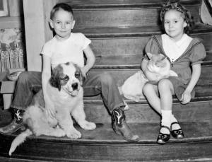 When scrolling through old pictures, I found these two. In the first one, Steve and I are sitting with our beloved pets. Bobo, only three months old, and Timmy, who lived 21 years. Timmy was my only best friend until I left home. Bobo didn’t last too long. He had a habit of eating any shoe in sight and trampling our neighbors flower gardens. In an effort to block him from going upstairs to eat more shoes, Dad constructed a tall gate at the bottom of the stairs. This 180-pound dog took one look at it, leaned into it with his weight, and it went crashing down. He ended up at someone’s farm. It broke my heat.