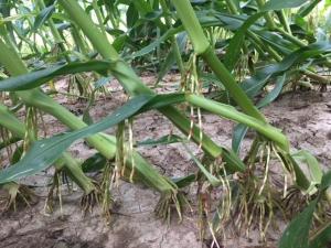Corn puts out extra roots called ‘brace roots’ as it’s gets bigger. Usually they’re 4” above the ground, just to help brace the corn as it gets bigger. Notice these roots coming out 18” up?