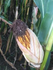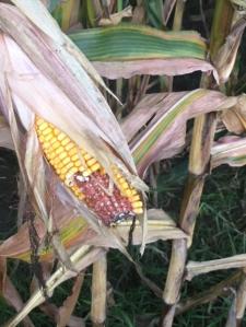 So that silk didn’t get pollinated for some reason. And the odd shapes, I’m not sure, but obviously, something didn’t all work right. Too cool, too wet? Too dry at that point? Who knows? All part of the mystery. Splitting the ear, there are nice kernels in there.