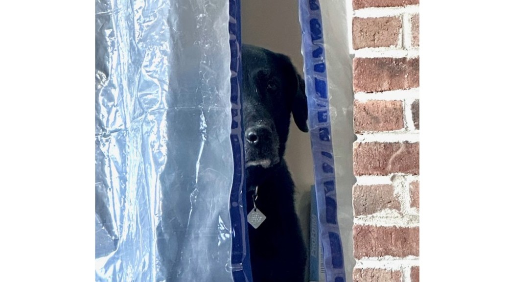 The bathroom remodeling is in the dusty ‘sanding drywall’ phase. The guys are doing a pretty good job putting up plastic and sealing things, but that dust…it gets everywhere. Kelly taped baffles over the gap at the bottom of the doors, and even that didn’t help. I picked up my computer mouse and there was a dusty outline of that. And that was at the far end of a room with the door closed. Sigh. Part of the deal. This too shall pass. That’s Humphrey peeking through the plastic in the header photo, he’s just wondering when this will finish. Kinda like daughter. The guys know it’s not personal when she comes out of her room and yells, “WHEN ARE YOU GOING TO BE DONE!??” It’s just messing up her routine.